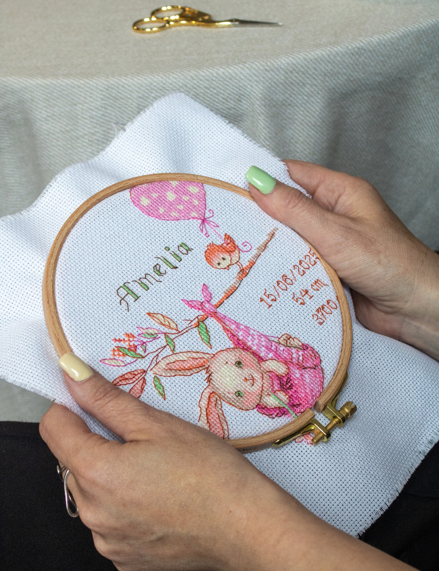 Perfect for stitchers of all levels, this project makes a cherished gift for parents and families. As you stitch, each detail—the bunny’s sweet face, the soft balloon, and the delicate floral branch—will come to life, creating a personalized piece filled with love and memory.