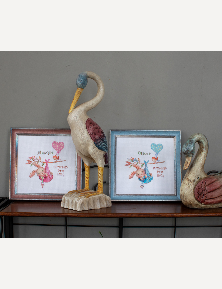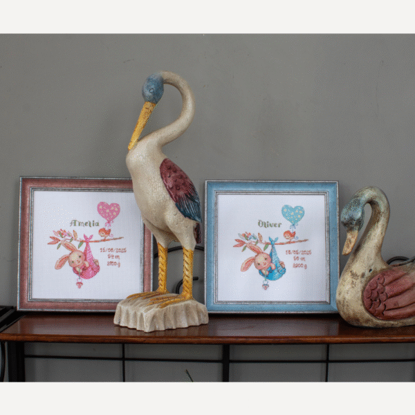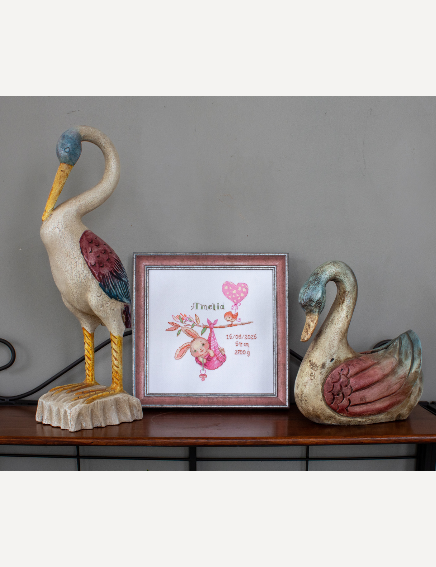 This Aine cross stitch kit A1029 features a baby bunny in a pink sling hanging from a branch, with a bird and a heart-shaped balloon. The design captures the sweetness of welcoming a new baby girl and includes space to personalize with the baby’s name, date, weight, and height. Perfect for creating a meaningful handmade keepsake, this kit brings warmth and joy to your embroidery collection.